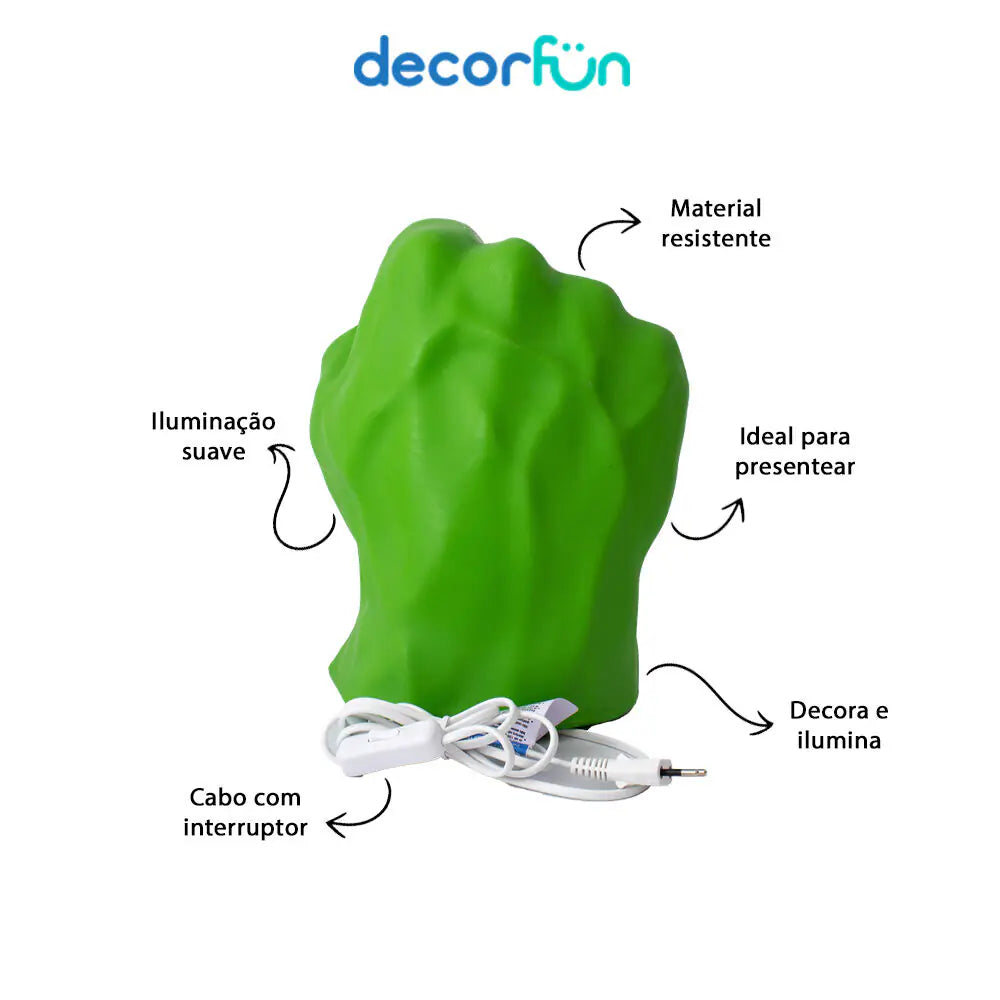 Inspirada no poderoso herói da Marvel, essa luminária verde vibrante é perfeita para decoração geek, quartos infantis ou até mesmo um cantinho temático especial. Além do visual impressionante, ela proporciona uma iluminação difusa, ideal para momentos de leitura ou para criar um ambiente mais aconchegante.